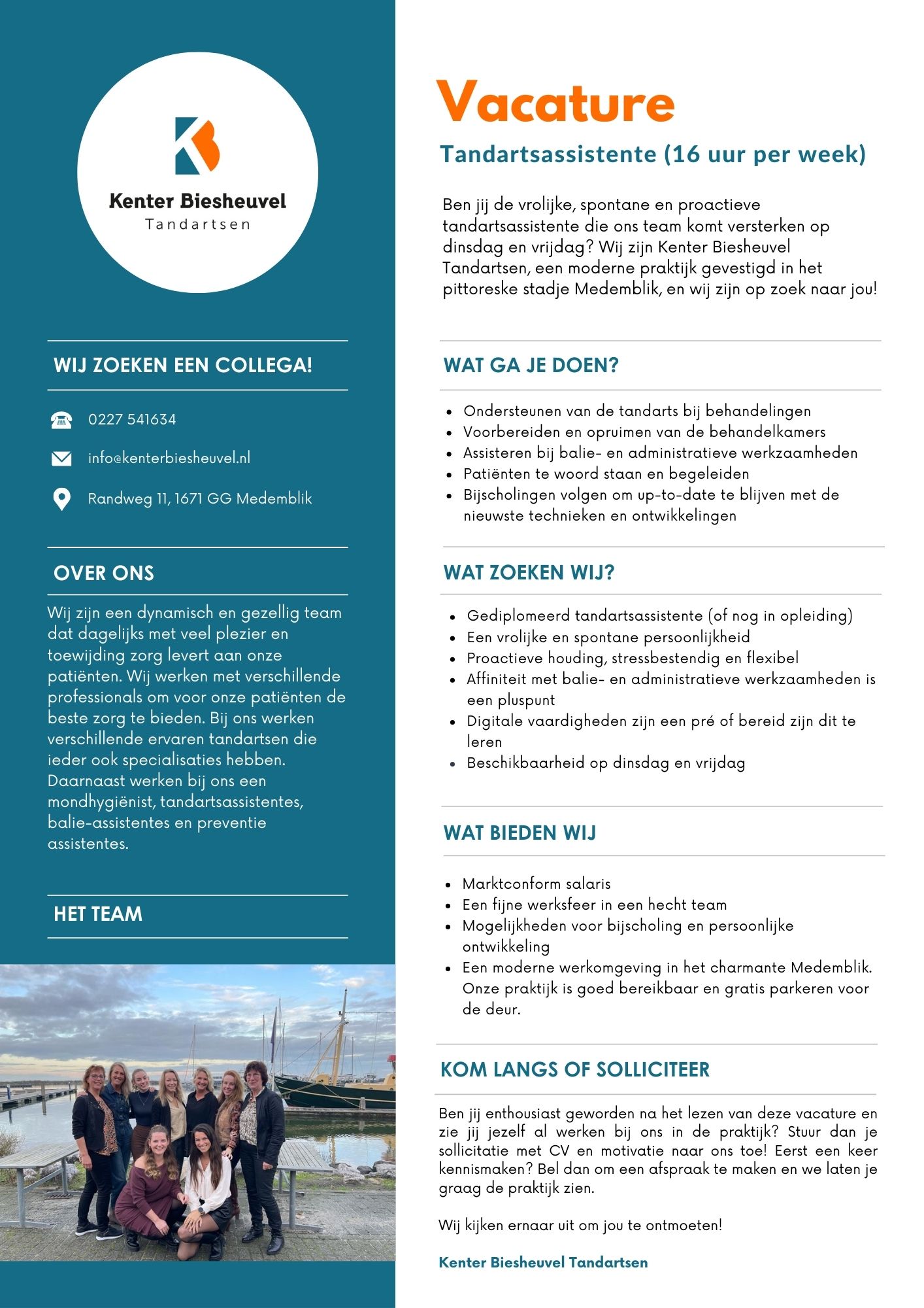 Ben jij de vrolijke, spontane en proactieve tandartsassistente die ons team komt versterken op dinsdag en vrijdag? Wij zijn Kenter Biesheuvel Tandartsen, een moderne praktijk gevestigd in het pittoreske stadje Medemblik, en wij zijn op zoek naar jou!